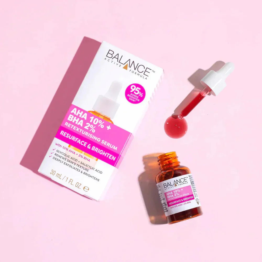 Balance Active Formula AHA + BHA Retexturizing The serum is formulated with 10% AHA (glycolic acid) and 2% BHA (salicylic acid). This combined serum deeply exfoliates, brightens, and improves skin texture.
